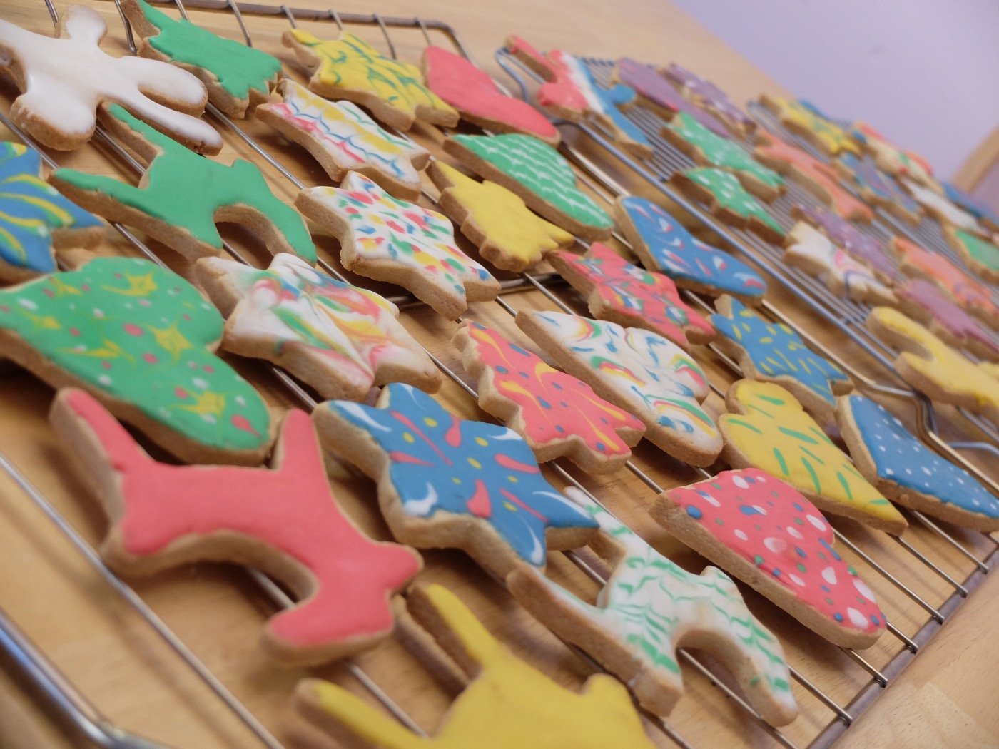 Martin avait heureusement des emporte-pièces, sinon j’étais bonne pour le découpage à l’aide d’un verre ou d’un couteau. Jonathan est venue ensuite me filer un coup de main pour la décoration, le tout sur fond de Glenn Miller.