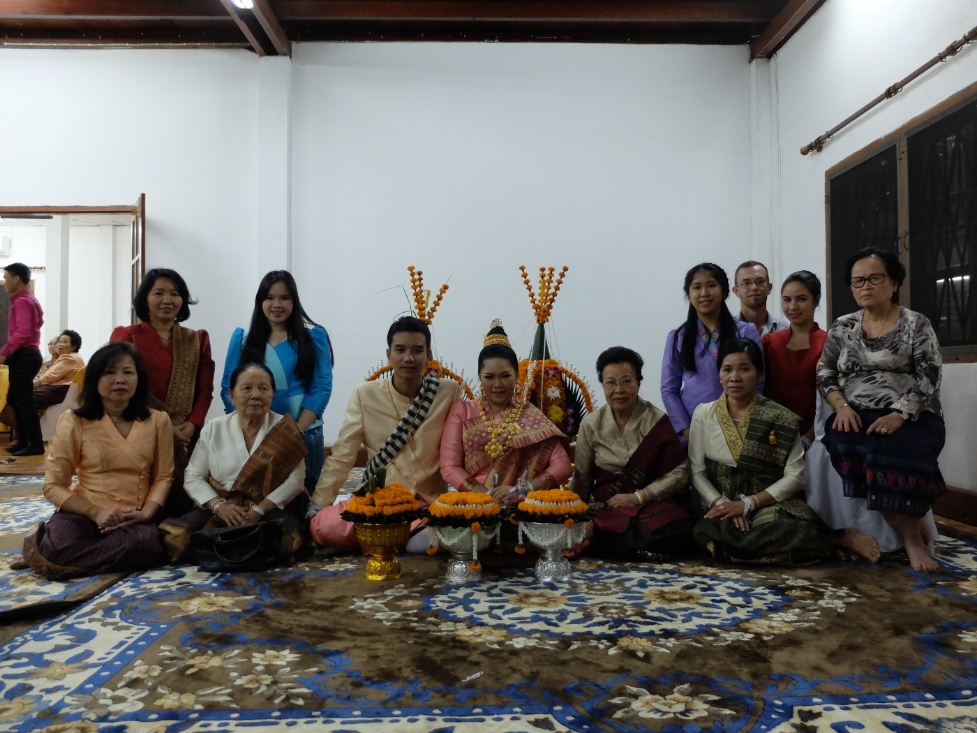 Heureuse de pouvoir assister à un mariage (dans ma famille qui plus est), je me suis installée pour écouter la cérémonie (tout le monde n’y assiste pas). La position devient très vite inconfortable, et mon sinh trop grand déploie des merveilles d’inventivités pour ressembler à tout sauf à une jupe sur moi. Bref, la laotienne gracieuse, on oublie…