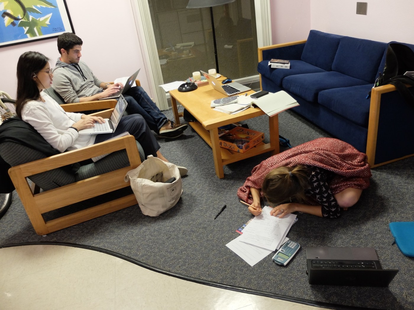 Le lundi, c’est reparti pour une nouvelle semaine avec ses soirées studieuses… Ici, Grete se demande si elle ne serait pas plus efficace en travaillant sur le sol.
