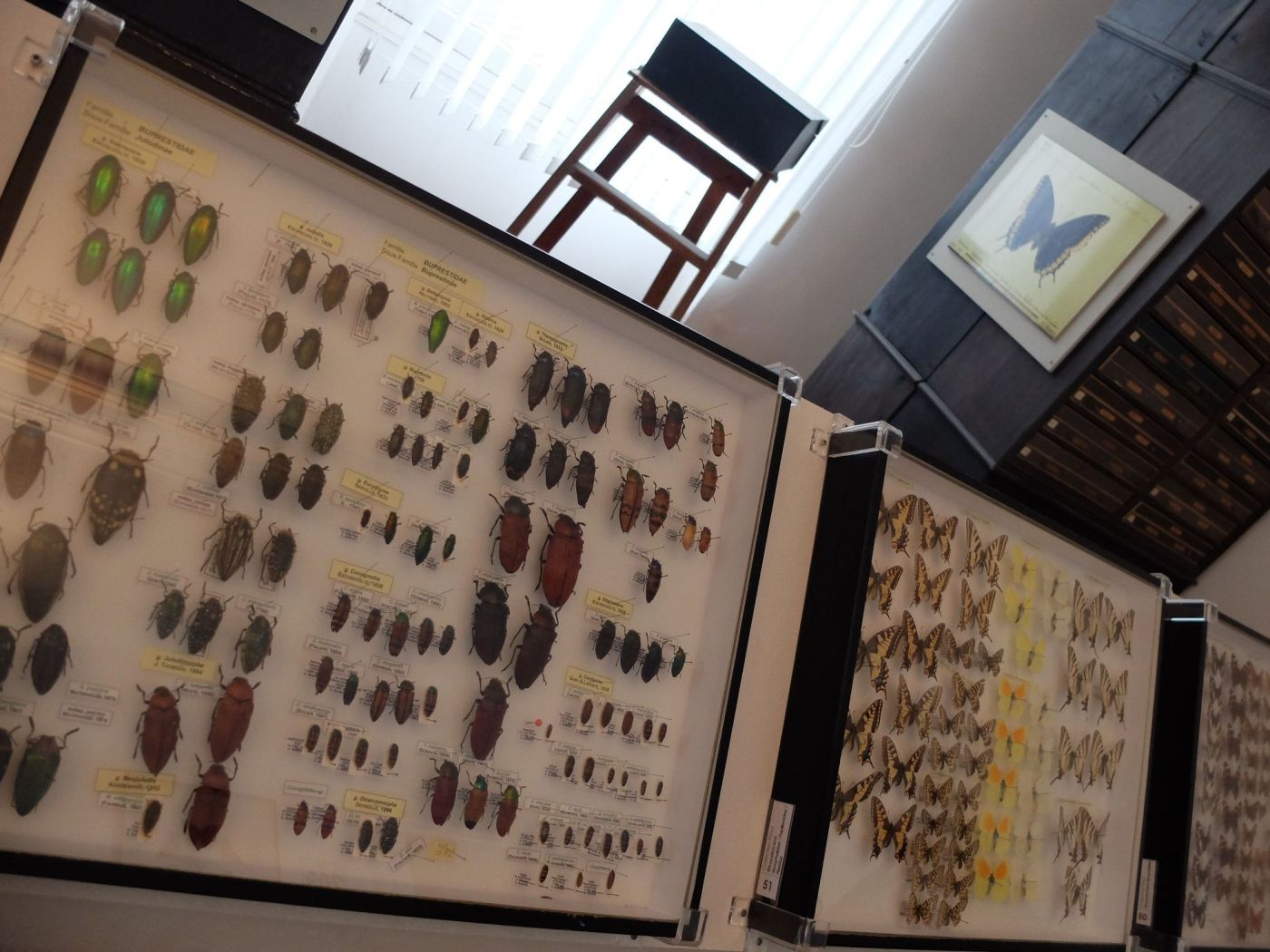 Une partie du matériel utilisé par le taxidermiste, surveillé par une immense grenouille-taureau.Une très belle collection de coléoptères, mais aussi de tiroirs !