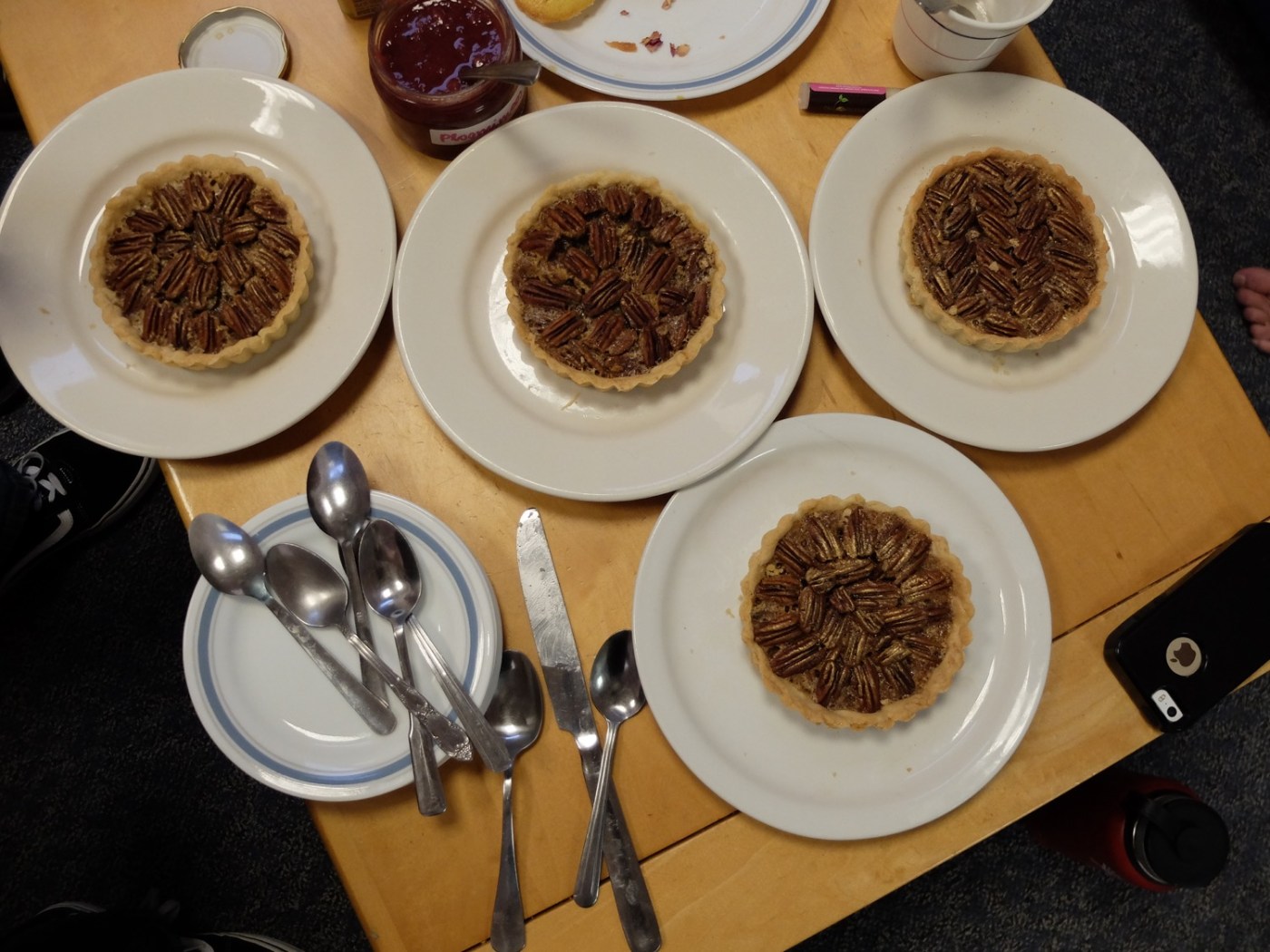 Pour une bonne tarte aux noix de pécan, spécialité d’Isaac, il faut vider une bouteille de sirop de maïs dans la pâte. Ariane et moi nous regardons avec appréhension devant la quantité de sucre… Mais en réalité, le résultat est étrangement pas trop sucré ! Bon, les calories sont probablement toujours là, elles…Direction le four !