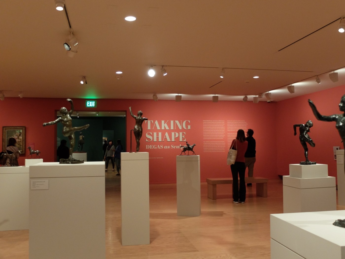 Il n’y a rien à redire sur la muséographie très sympathique de l’exposition sur Edgar Degas : trois salles, trois thèmes, et des oeuvres bien mises en valeur avec ces murs colorés dont j’affectionne le côté audacieux. Dans la salle « rouge », on observe de petits groupes de statuettes comme les danseuses réajustant leurs bas (voir ci-dessus). Placées juste à côté du tableau Dancers in the Wings, on voit clairement les thèmes chers à l’artiste, tout comme on apprécie également l’individualité de chaque modèle.