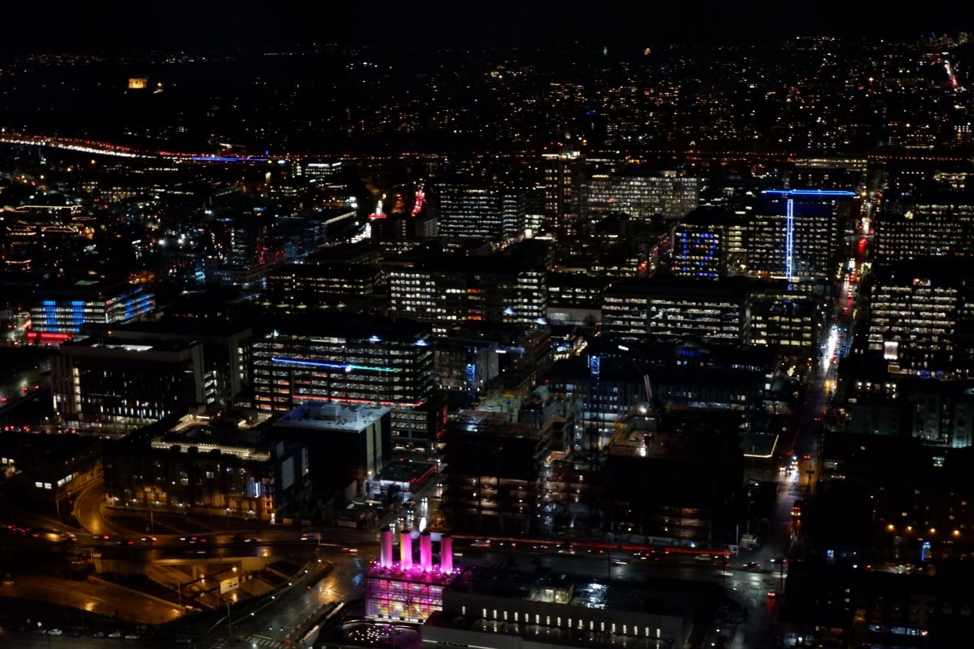 On peut même deviner le sens de circulation des voitures.La mer, indiquée par une immense masse noire.L’originalité de la plateforme vitrée ici, c’est qu’elle tourne ! On peut donc s’installer et admirer la vue, cependant c’est très, très lent…Un bleu « science-fiction » et une architecture claire aux formes modernistes. J’insiste sur le caractère rétro-futuriste…