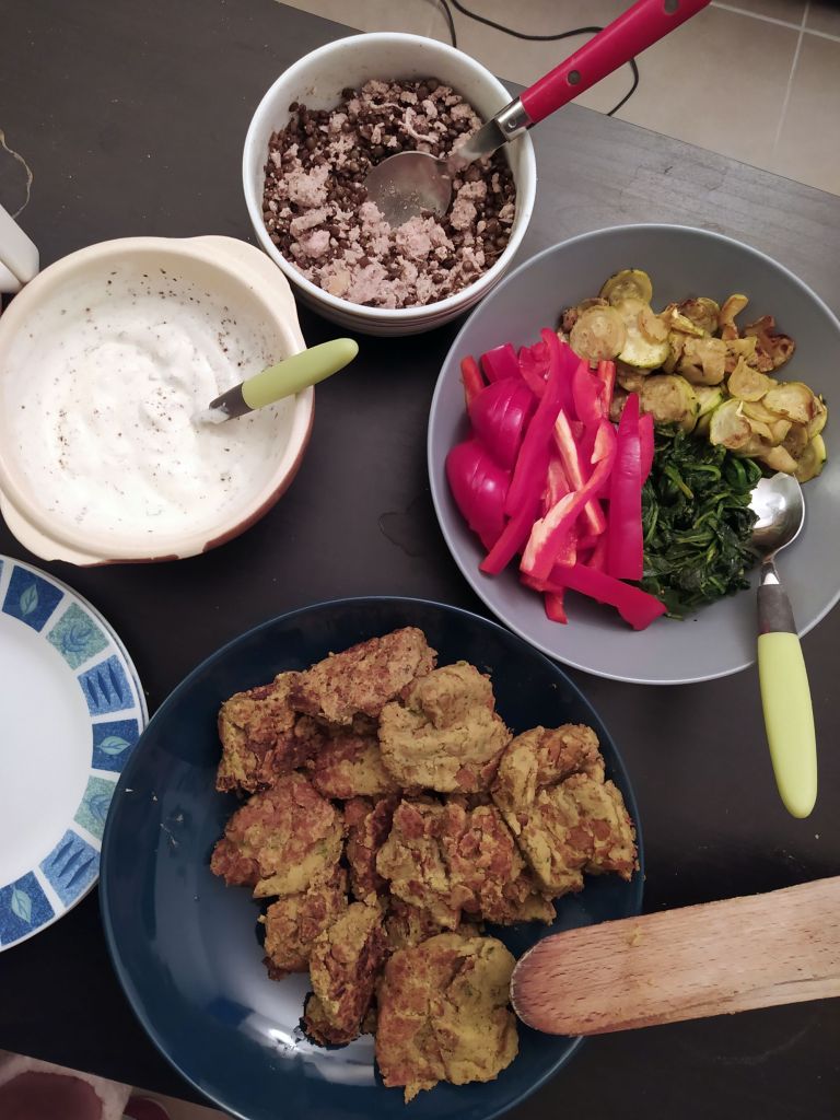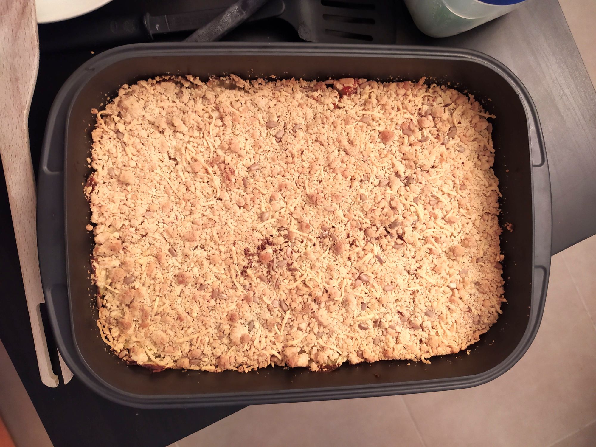 Crumble aux pommes ? Que nenni, à gauche, nous avons un mac’n’cheese pas très traditionnel car on l’a fait avec des pâtes complètes et des épinards; à droite, nous avons effectivement un crumble, mais salé, avec de la pâte au parmesan sur une couche de courgettes, tomates et oignons. On explore, on explore…