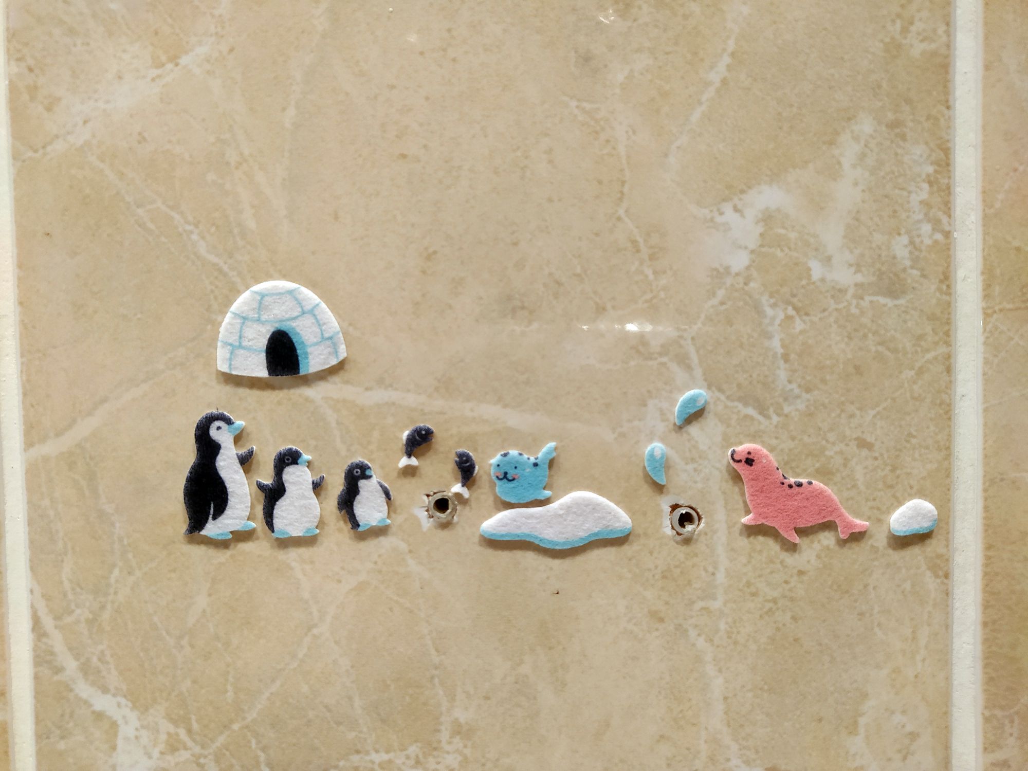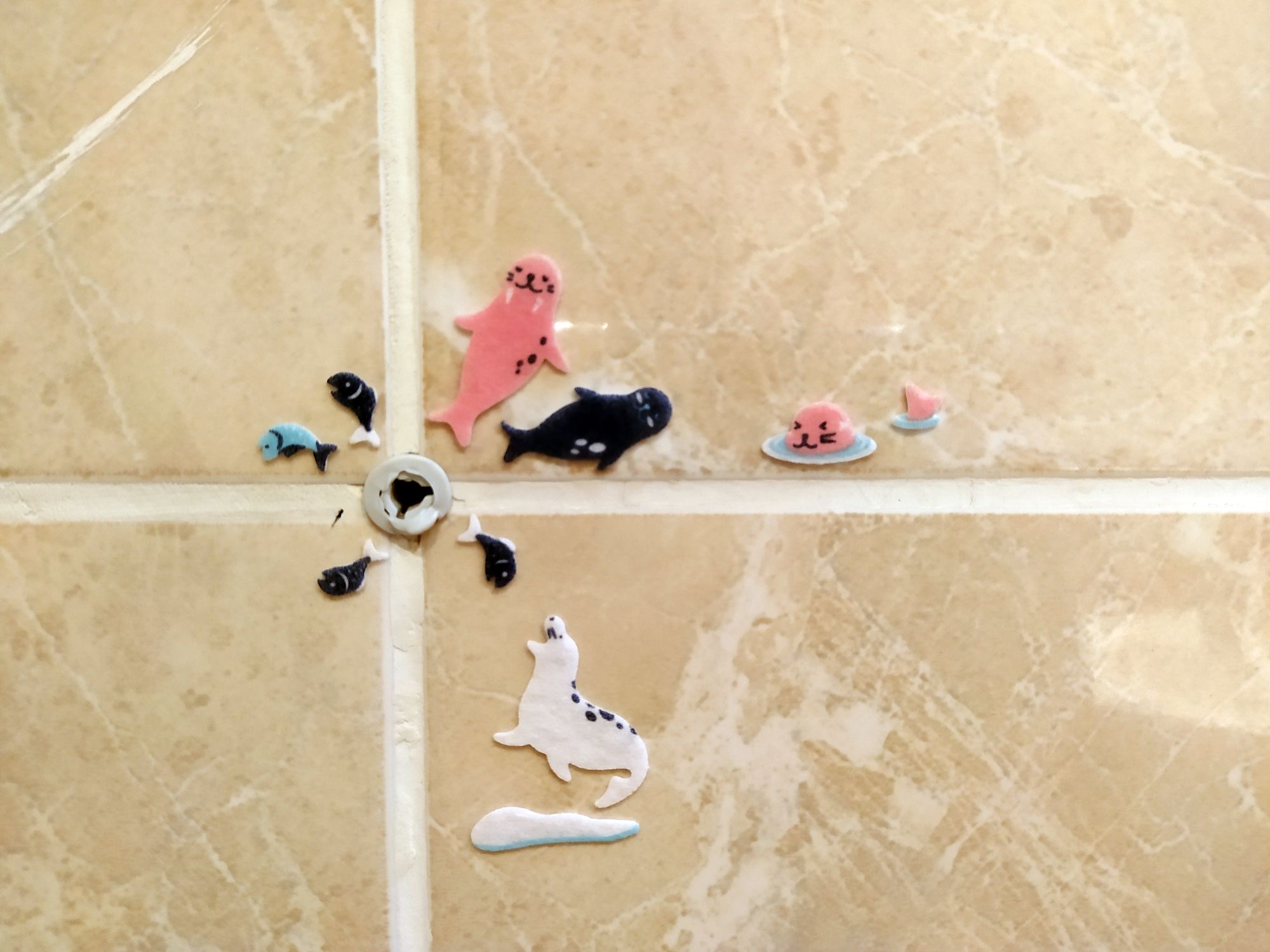 Vous n’avez plus faim ? Voilà des petits pingouins et phoques des régions froides que nous avons mis dans la salle de bain pour égayer la pièce. Notez la manière dont on se réapproprie les trous dans le murs, ainsi que le mélange des perspectives dignes d’une peinture d’Egypte antique !