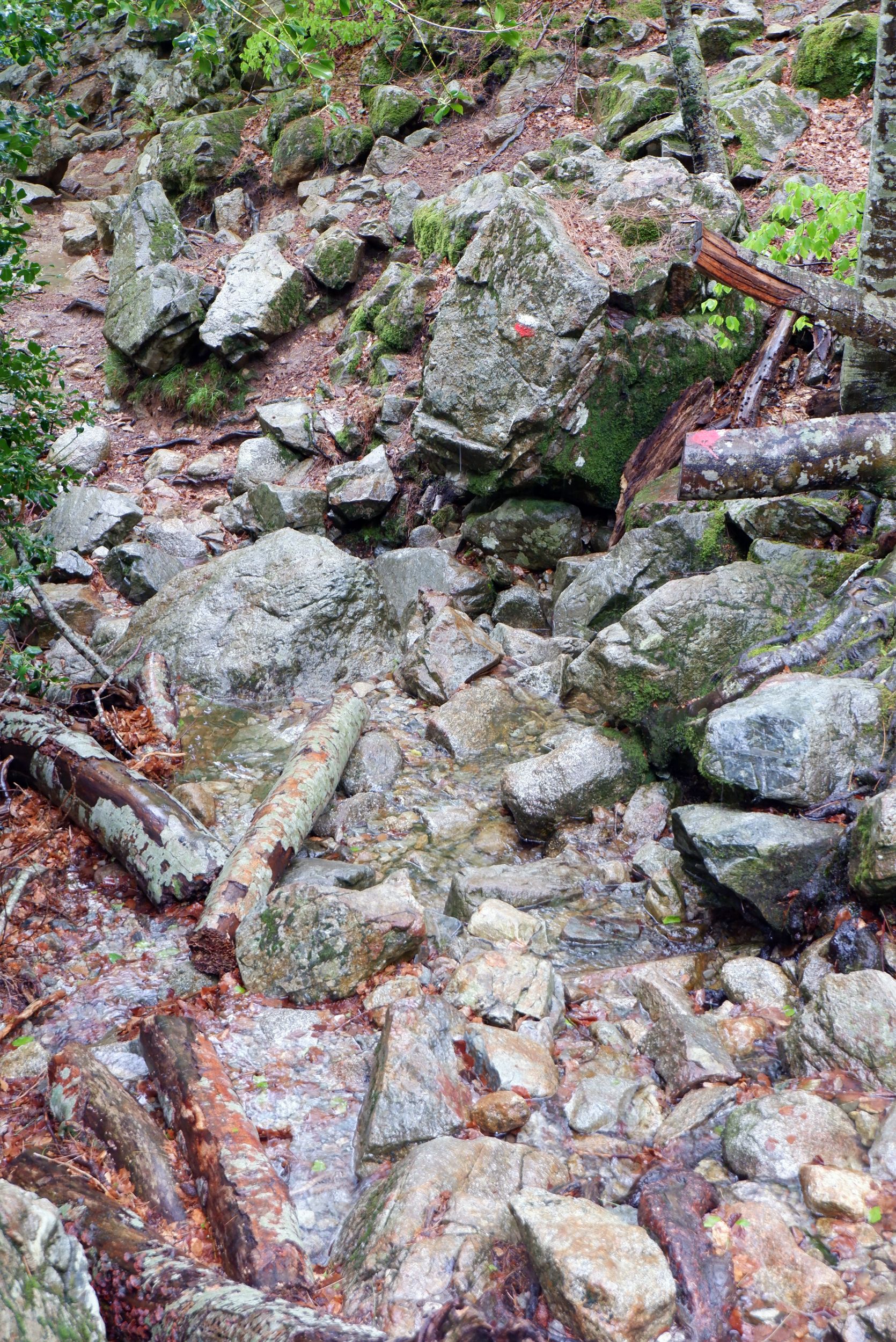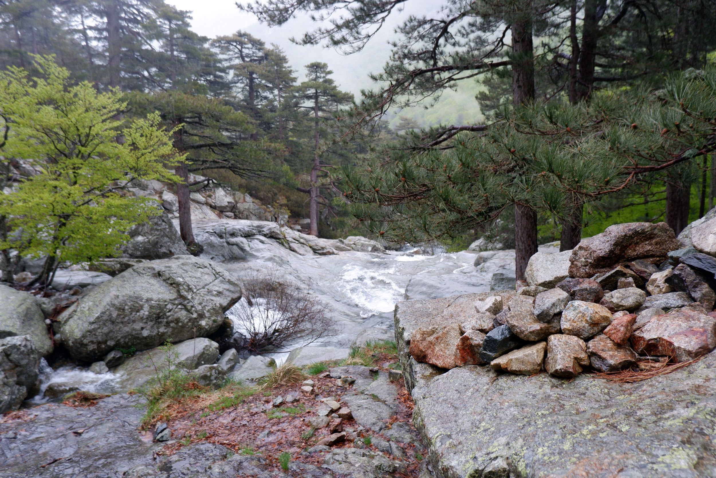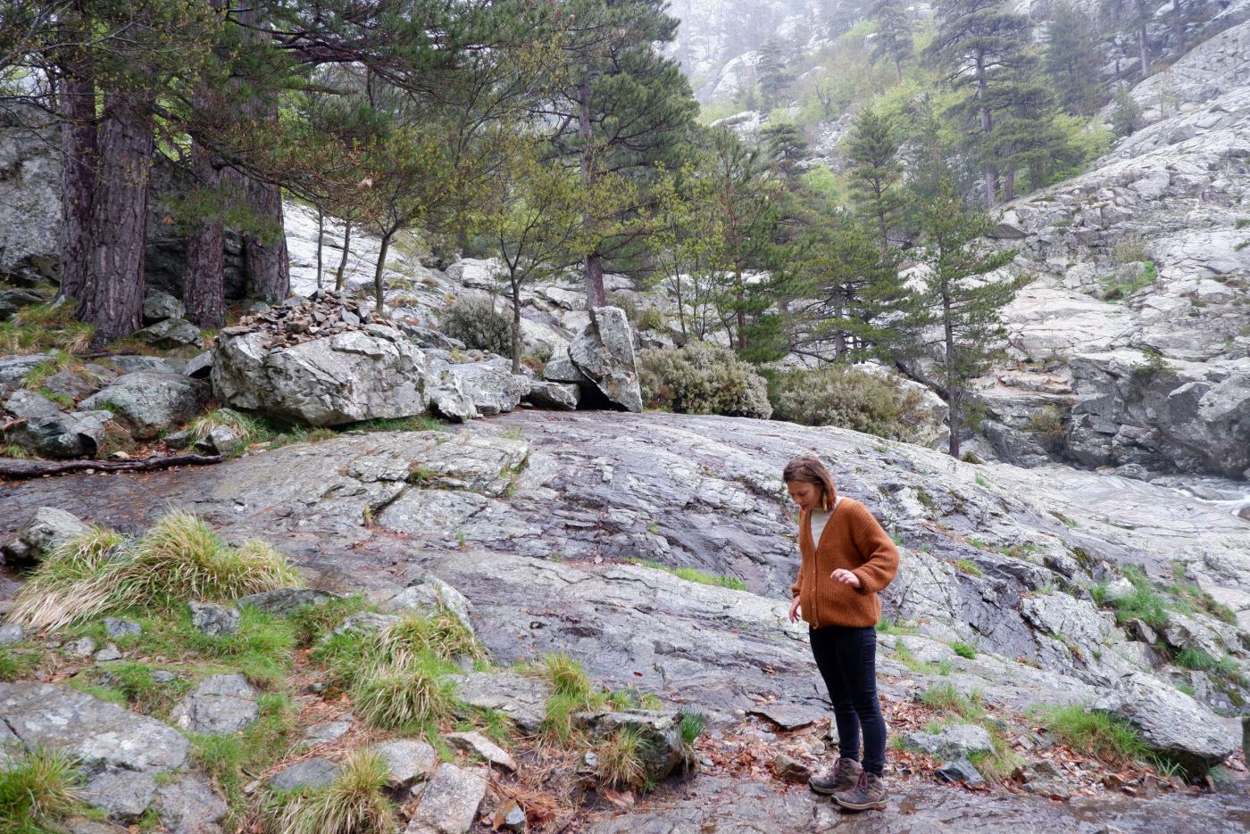 Escale à Vizzavona : il commence à pleuvoir et on sent que la température s’est un peu rafraîchie. Le thermomètre indique dix degrés celsius, les cimes des montagnes affichent de la neige. C’est parti pour trois heures de randonnée en direction de La Cascade des Anglais.On a nos bagages sur nous et il pleut en continu. Justine se couvre comme elle peut.La collection Printemps-Eté spécial « climat déréglé ». Je vous avoue que j’ai parfois eu l’impression d’être dans les forêts du Nord-Ouest des Etats-Unis tellement c’est vert…et humide.La forêt est malgré tout magnifique et on suit le sentier tout en étant accompagnées par le son de la rivière.Je n’ai pas beaucoup sorti mon appareil photo du fait de la pluie. Ci-dessus, on a déjà bien avancé dans notre randonnée et on constate qu’en altitude, le paysage se dégage pour se faire plus lumineux. Sans mes lunettes, je vois parfois des rochers très blancs et m’exclame « mais c’est de la neige ! ». Justine me répond que c’est simplement la couleur de la roche. D’accord, je m’emballe un peu…Changement d’écharpe, car la première est trempée. Nos affaires s’alourdissent sous le poids de l’eau. Il nous reste encore un bout de chemin et le Refuge de l’Onda… porte bien son nom.