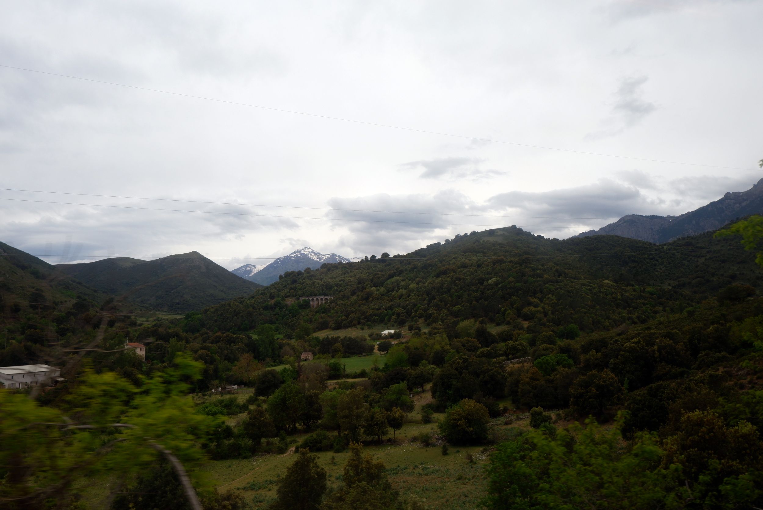A travers la vitre, le paysage est très vert, les montagnes magnifiques. Le train un peu vieillot, nous donne l’impression d’être dans un pays très différent. On voit des ponts, quelques ruines, des montagnes, parfois enneigées. Sous la grisaille, c’est bien loin de l’image que je m’étais faite de la Corse.