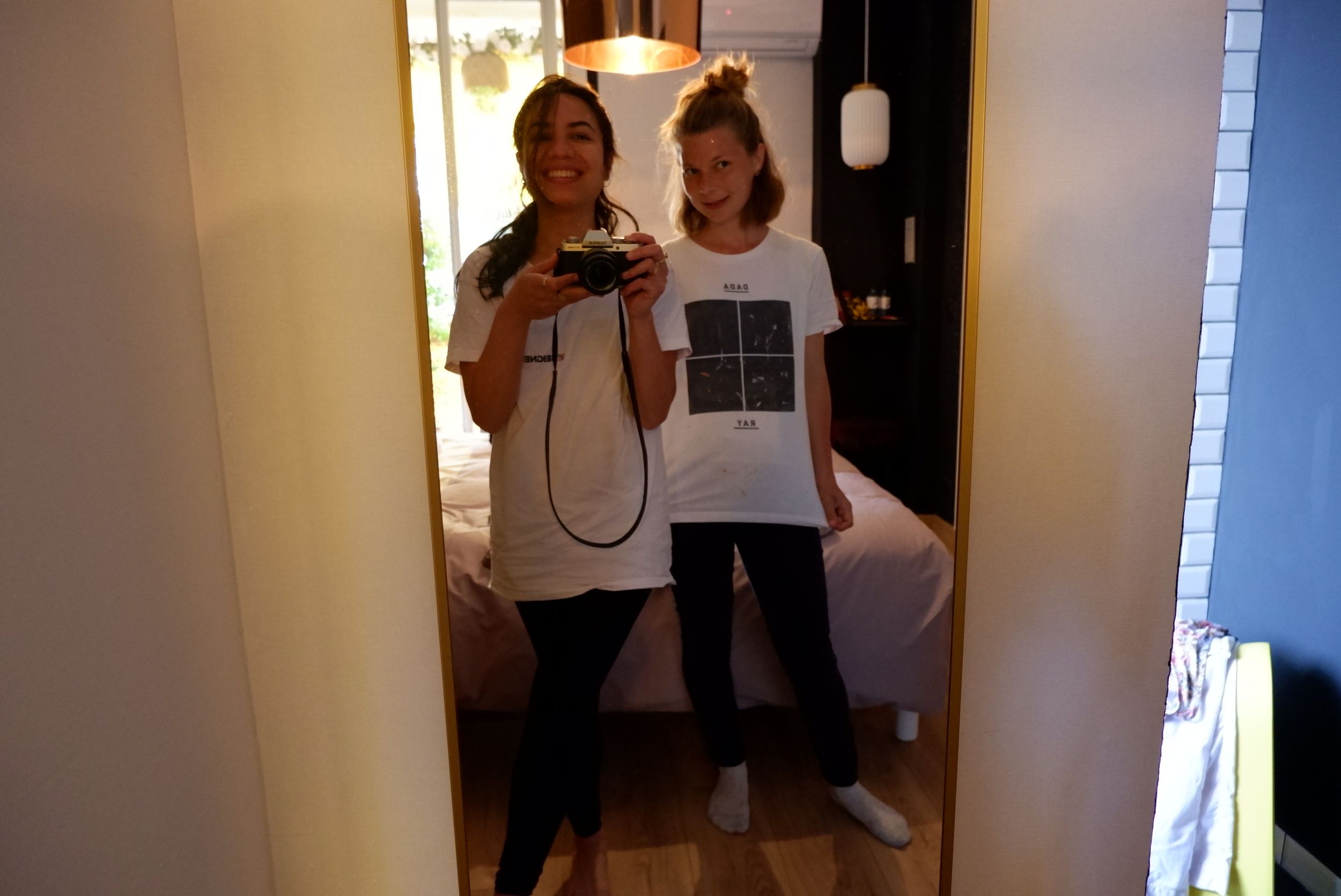 A Vizzavona, la femme au guichet de la gare nous allume le chauffage pour que l’on tente de se réchauffer et de sécher nos affaires un petit peu. Une fois à Ajaccio, les seuls vêtements à peu près secs sont deux paires de leggings et deux t-shirts de chantiers de Justine d’où le look assorti pour la fin de journée.