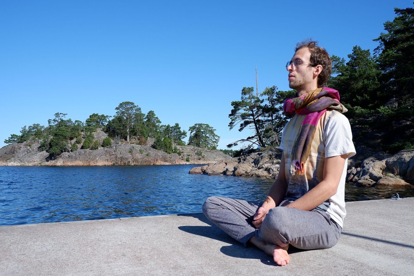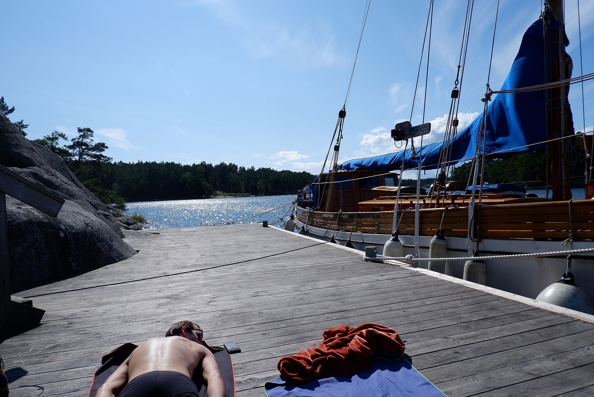 Le dernier jour, on a pris l’habitude de sauter dans l’eau froide et de prendre notre douche avec l’eau de mer réchauffée dans le sauna. Je savoure le plaisir d’avoir une douche immense avec vue sur la mer. L’eau est chaude alors je n’ai pas besoin de plus. Après un dernier plongeon glacé, on part faire la sieste sur un ponton un peu caché. Enfin, pas si caché, car on a vite été rejoint par tout le groupe !