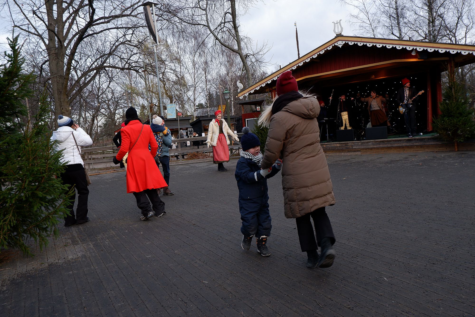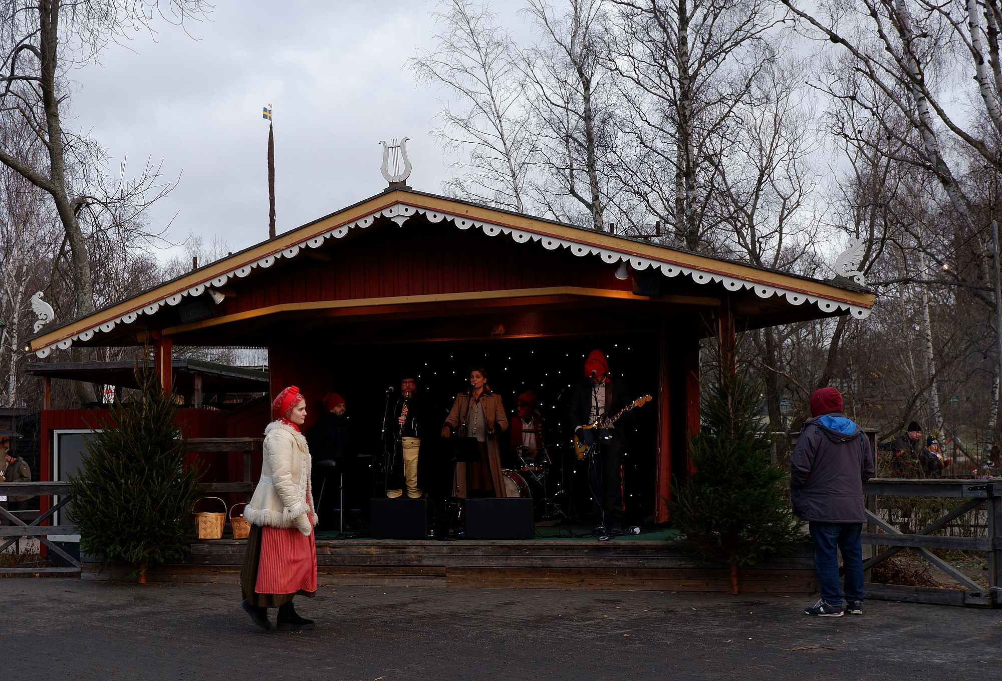 Au milieu de Skansen se trouve le marché de Noël aux parfums de saucisse grillée et de brioche au safran. Un groupe de musique joue des airs de Noël et d’autres morceaux en suédois que nous ne connaissons pas mais qui font danser tout le monde et ont même fini par entraîner tous les danseurs dans une chenille endiablée à travers le marché ! On découvre les loteries de Noël, les échoppes de viande et de poisson séchés, les stands de cadeaux de Noël surprises (cela nous a intrigués un moment, mais on a fini par se dégonfler…), de hot-dogs et de pains au safran.