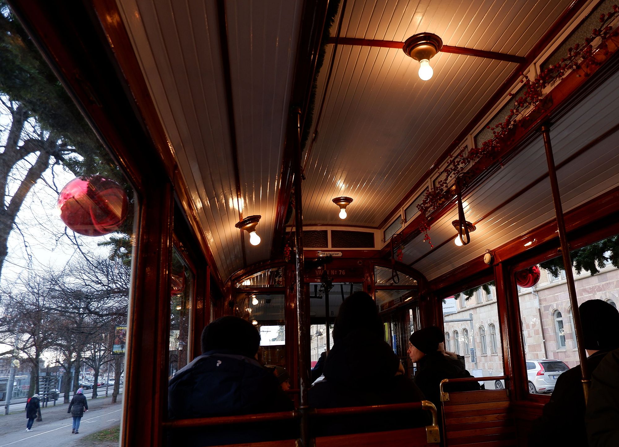Au lieu du tramway habituel et moderne, c’est un vieux trolley qui s’arrête devant Skansen. Un contrôleur portant un bel habit rétro nous invite à entrer et sonne une cloche pour indiquer au chauffeur le départ. On a l’impression de rêver et de ne pas être encore sortis du film de Noël commencé sur le marché quelques heures plus tôt. On est confortablement assis sur les sièges en bois, le radiateur sous nos fesses, et je caresse l’idée de jouer à Clara Clayton dans Retour Vers Le Futur 3 juste pour voir ce qui arrive lorsque l’on tire sur le signal d’alarme en forme de longue corde horizontale (vraiment comme dans le film !)