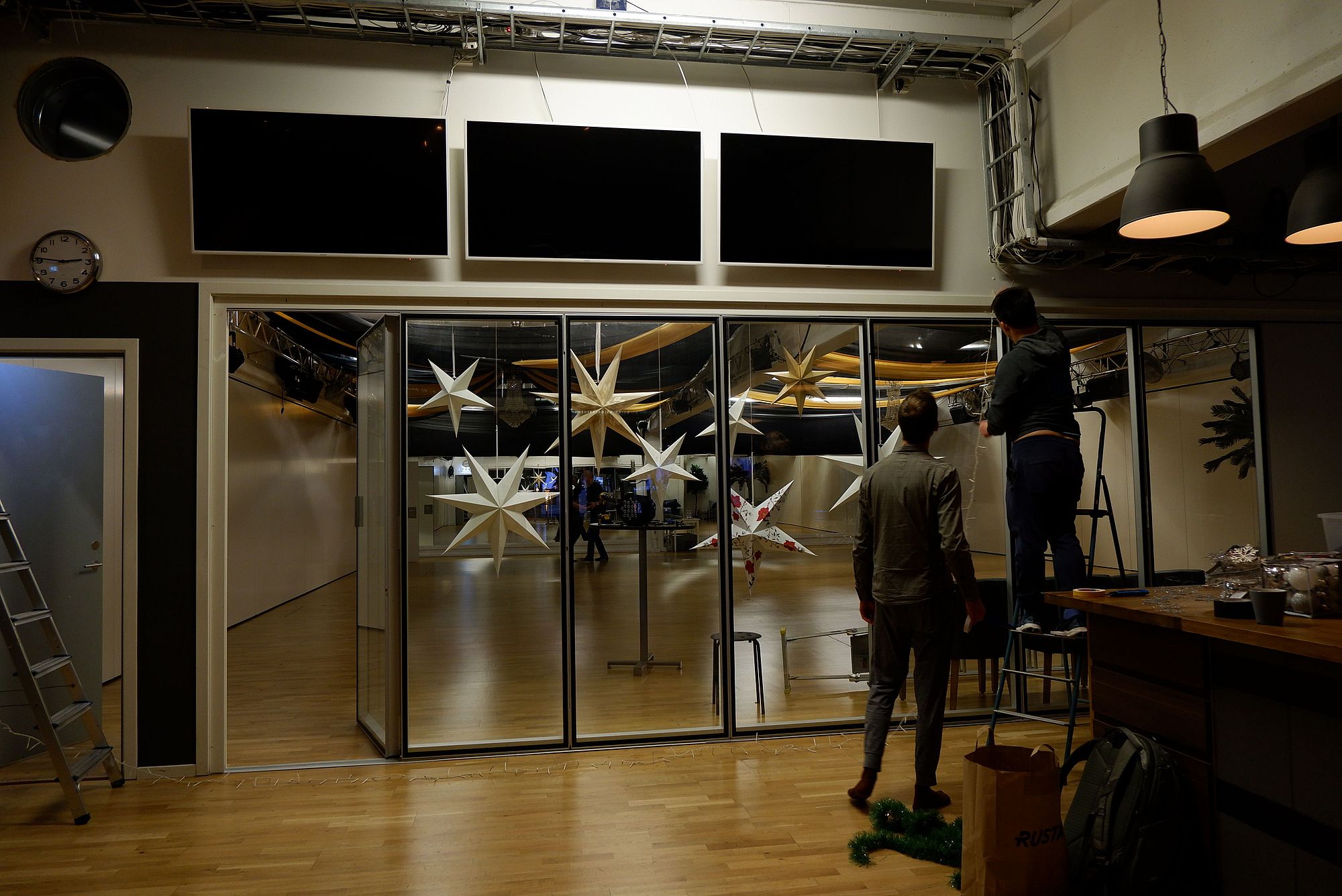 Au studio de danse, on file un coup de main à Robert et Amanda en train d’installer les décorations pour la soirée de Noël de la semaine suivante.