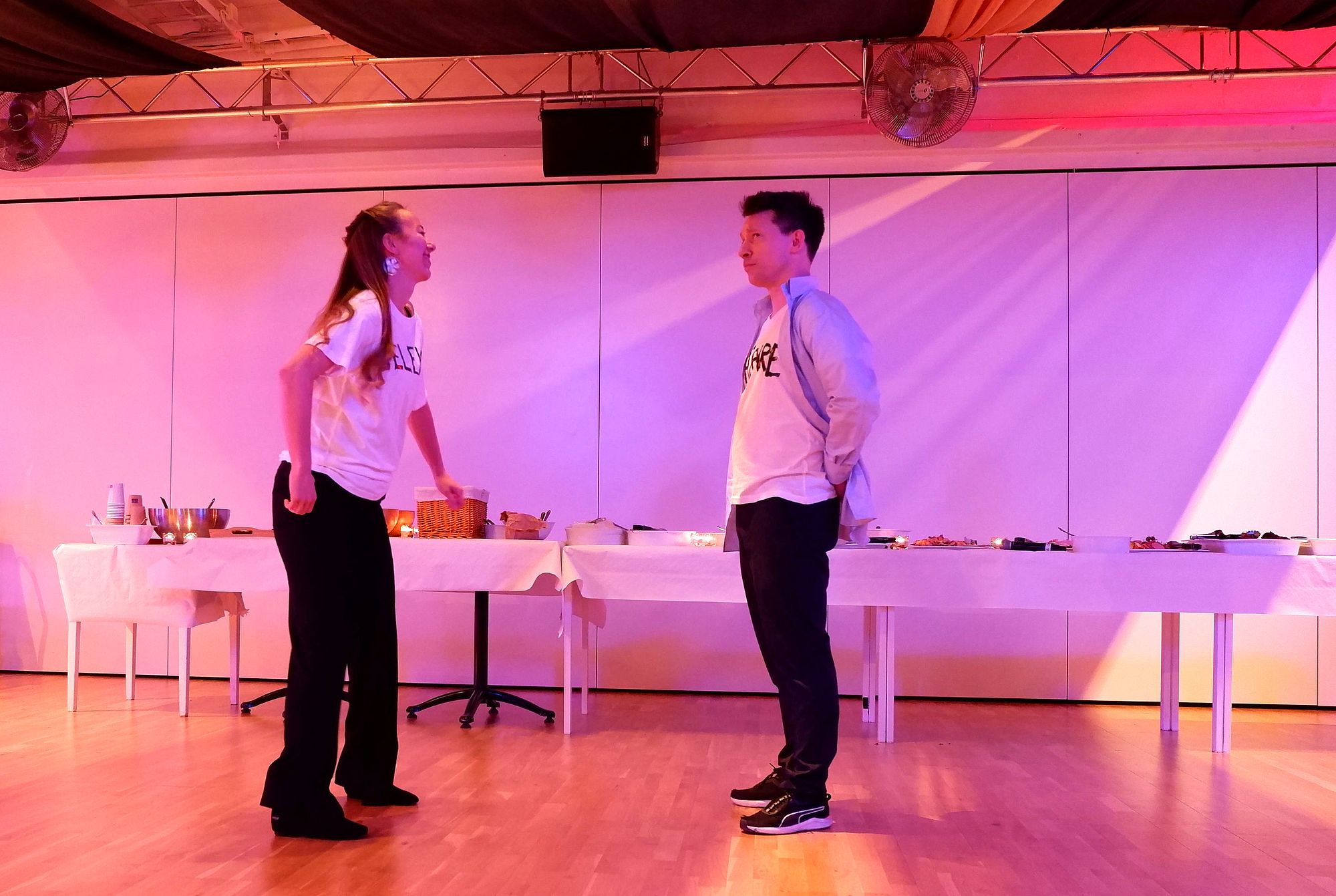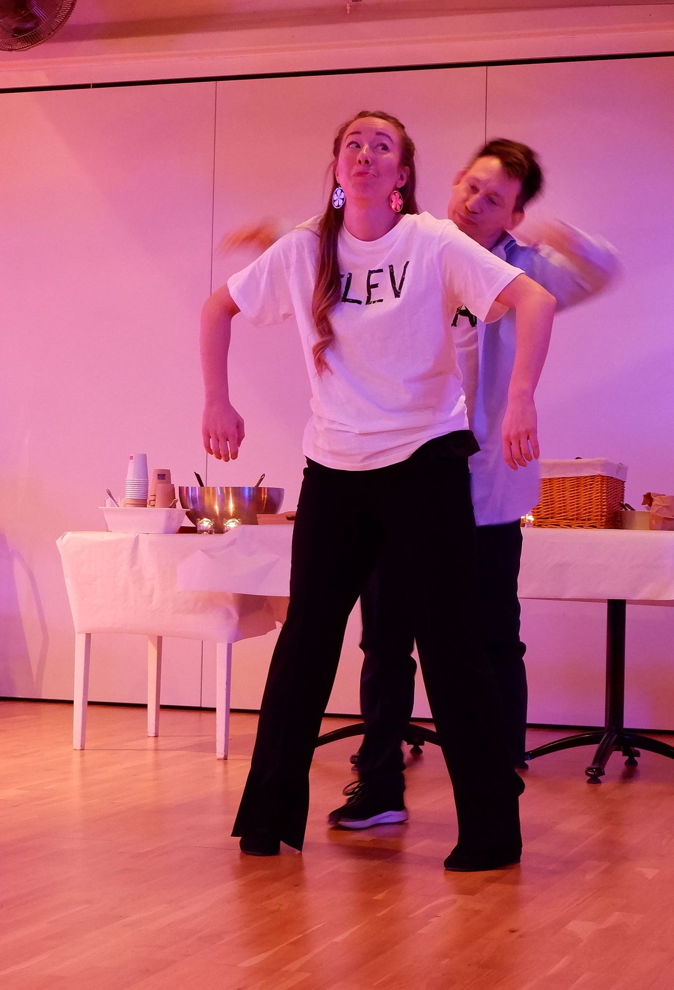 Robert et Amanda nous ont concocté un petit numéro humoristique au sujet d’une élève débutant la danse et de son professeur tentant de ne pas se prendre de coups de coude pendant les tours.