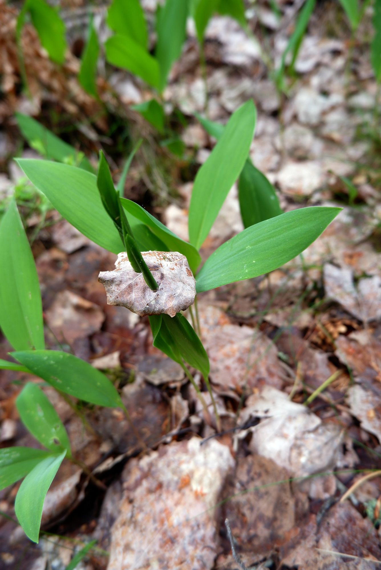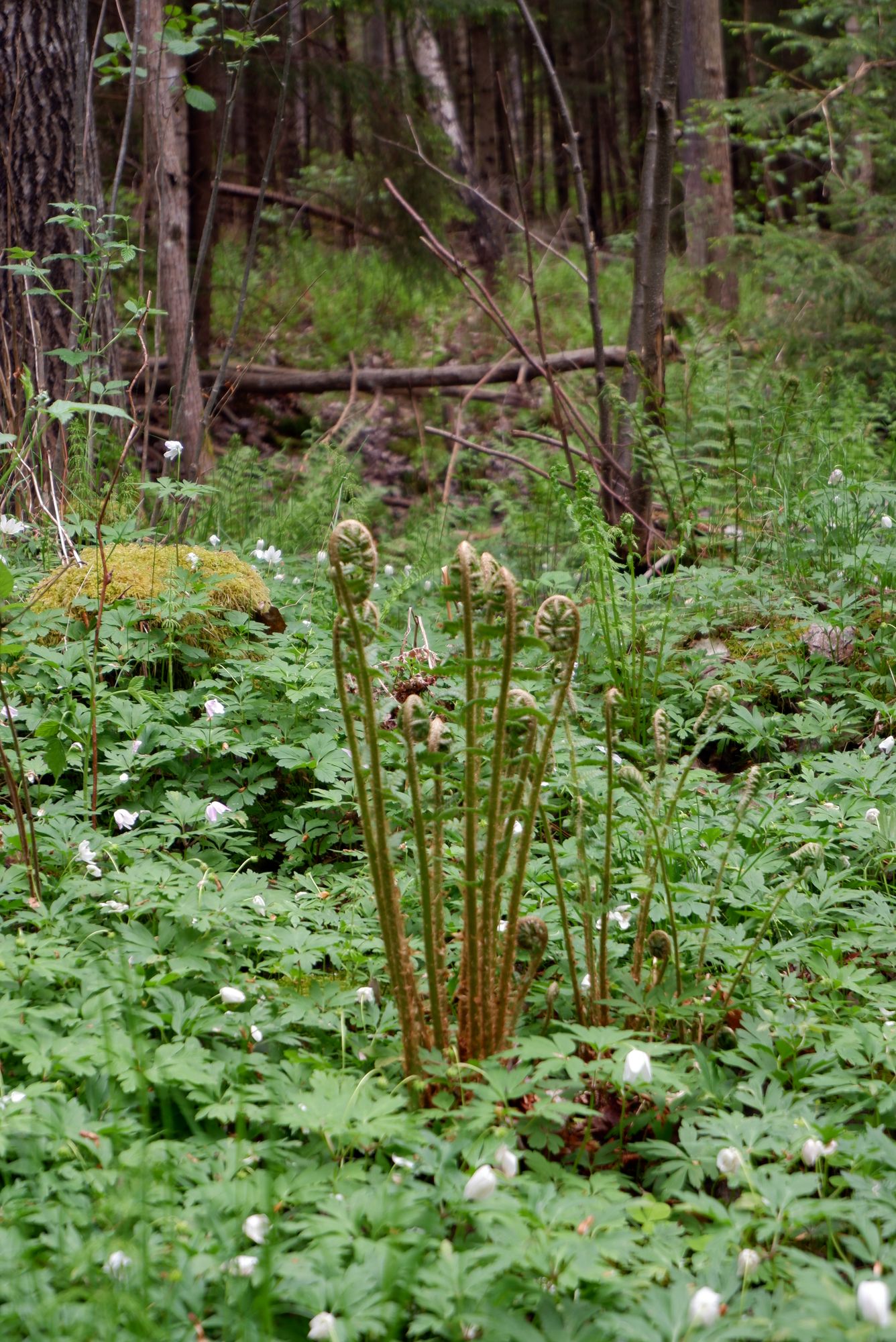 Ci-dessus, quelques jolis détails qui ont capté notre attention : de jeunes fougères prêtes à s’épanouir, des arbres aux troncs de lumière, du muguet à foison et une feuille morte qui sert de collerette à une jeune pousse.