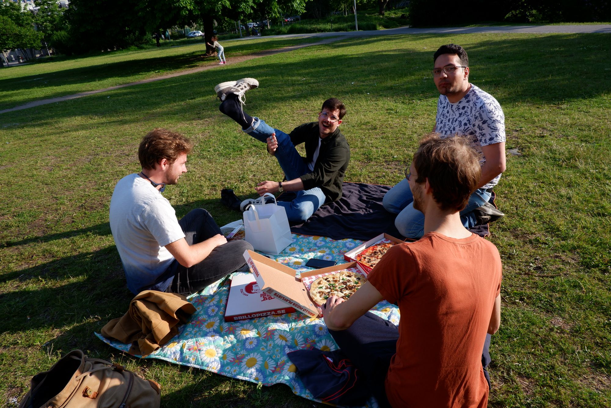 En parlant de pique-nique, ci-dessus un dîner sur l’herbe improvisé au bord du lac de Trekanten (à-côté de chez nous, là où je vais me baigner le matin !) avec des collèges de Ryan. Des copines suédoises m’avaient dit que le rituel était d’aller chercher des pizzas chez Brillo (notamment une aux oeufs de poisson, mais on s’est dégonflés à la dernière minute) pour ensuite les manger au bord de l’eau…