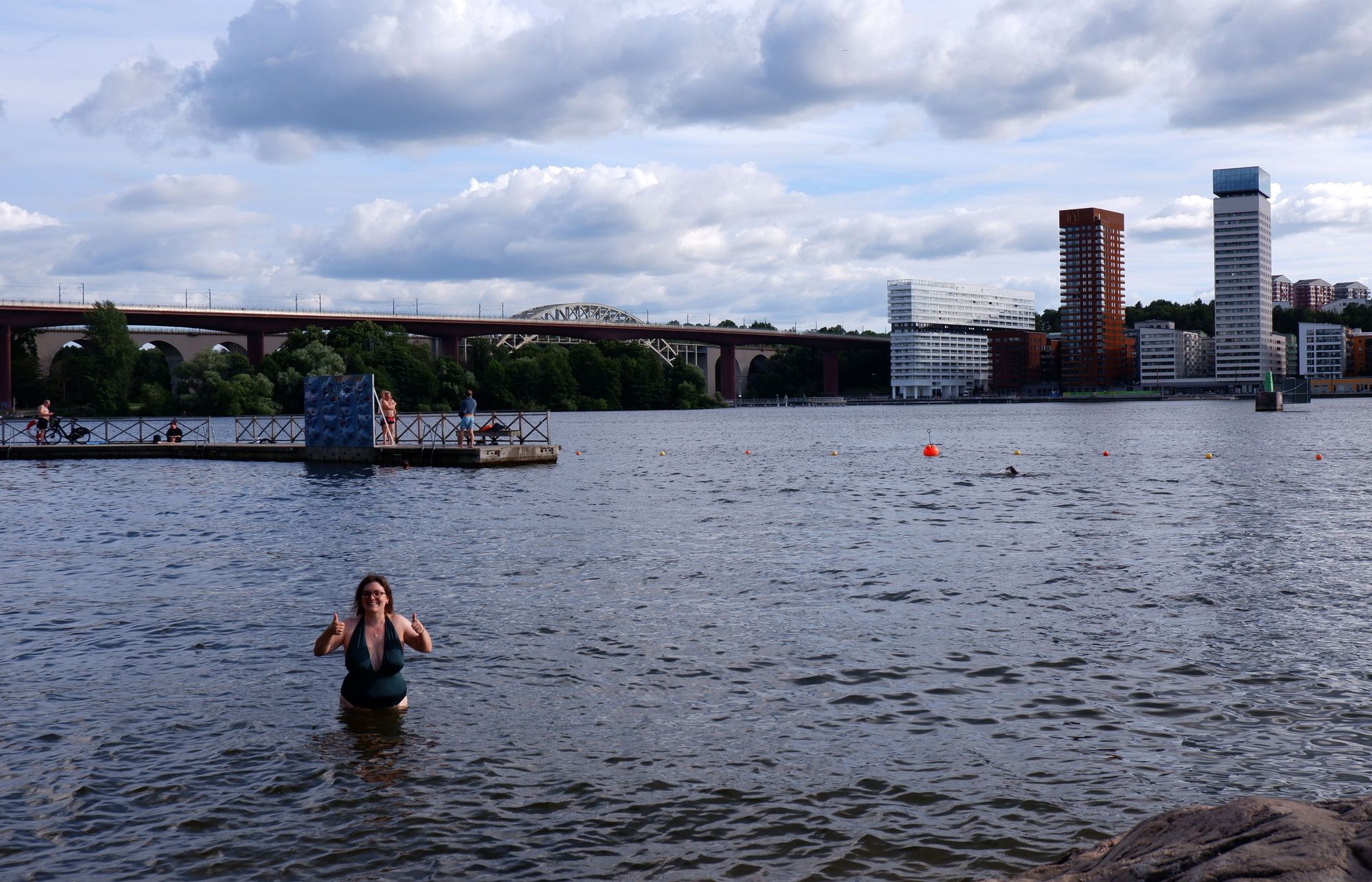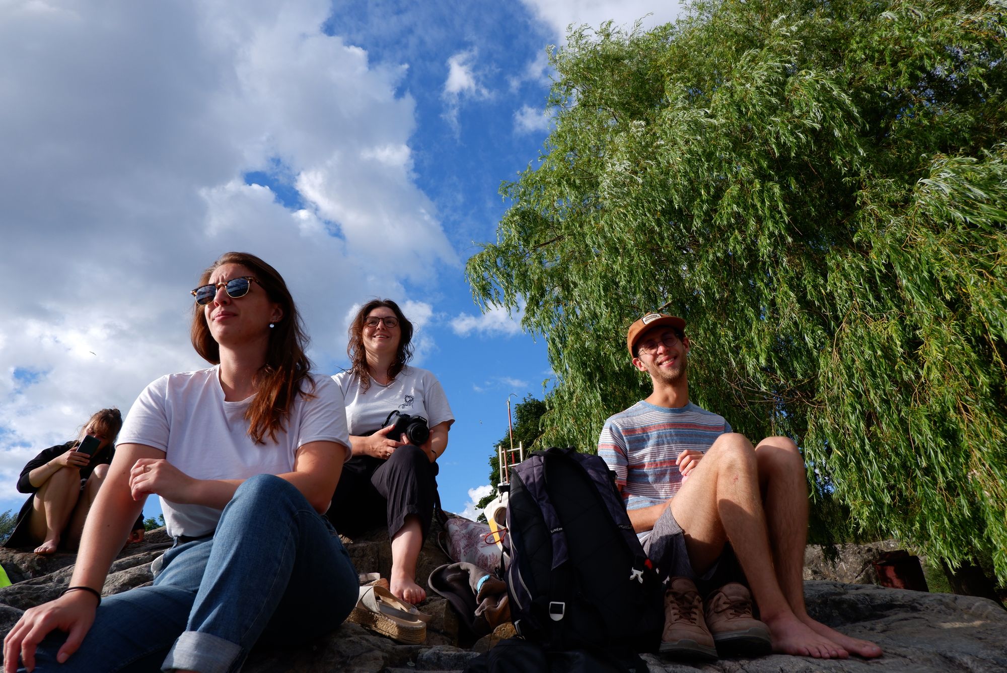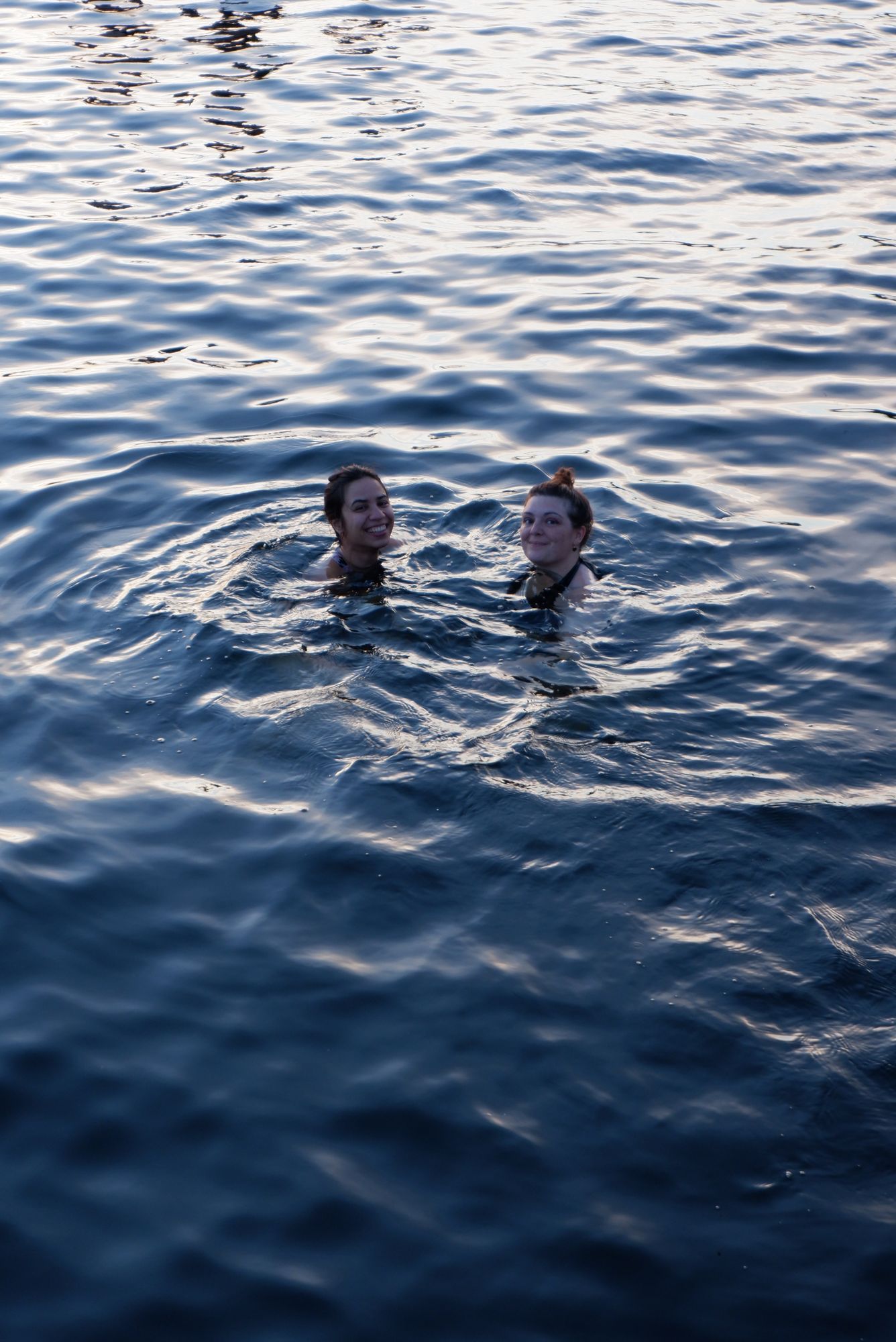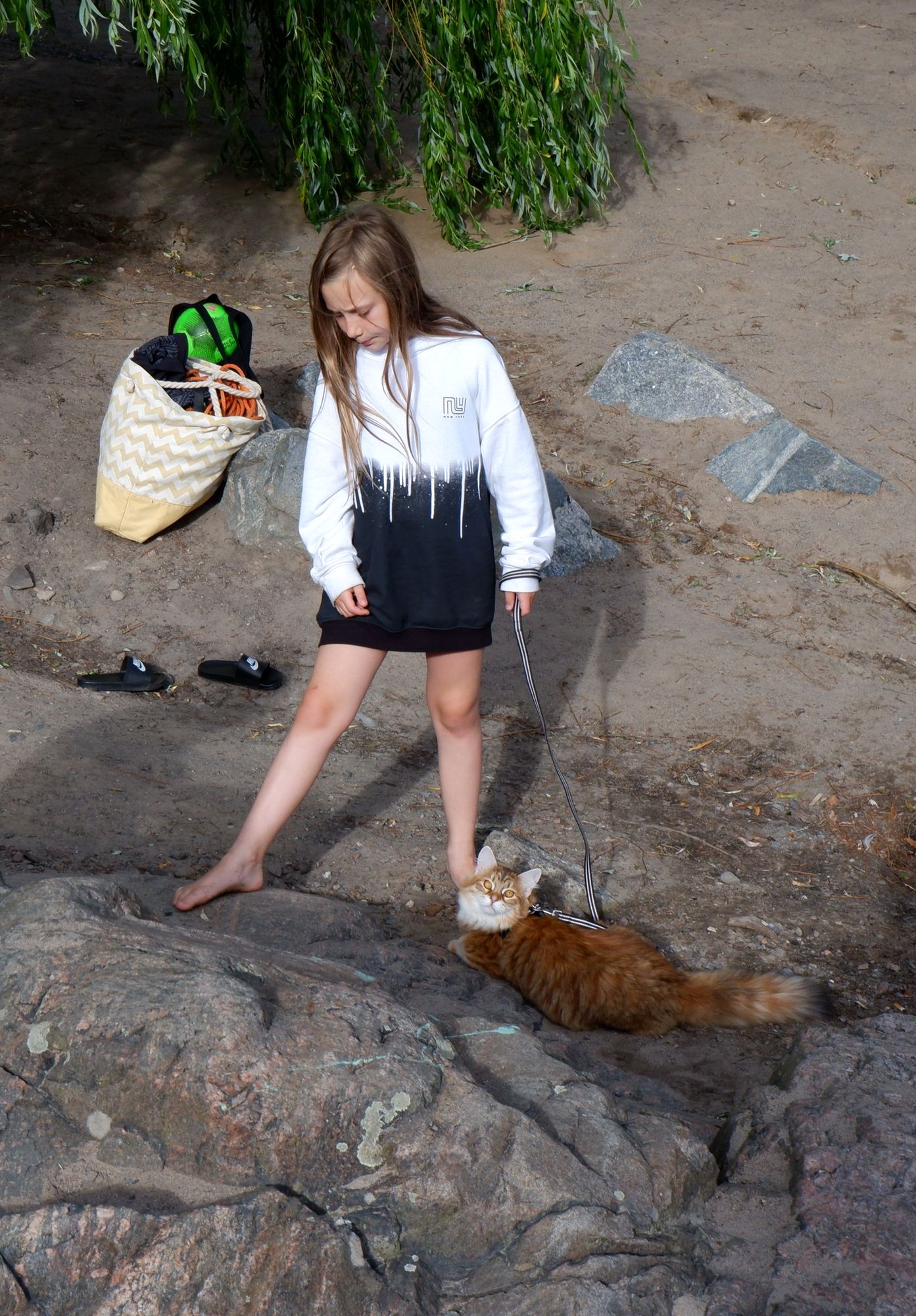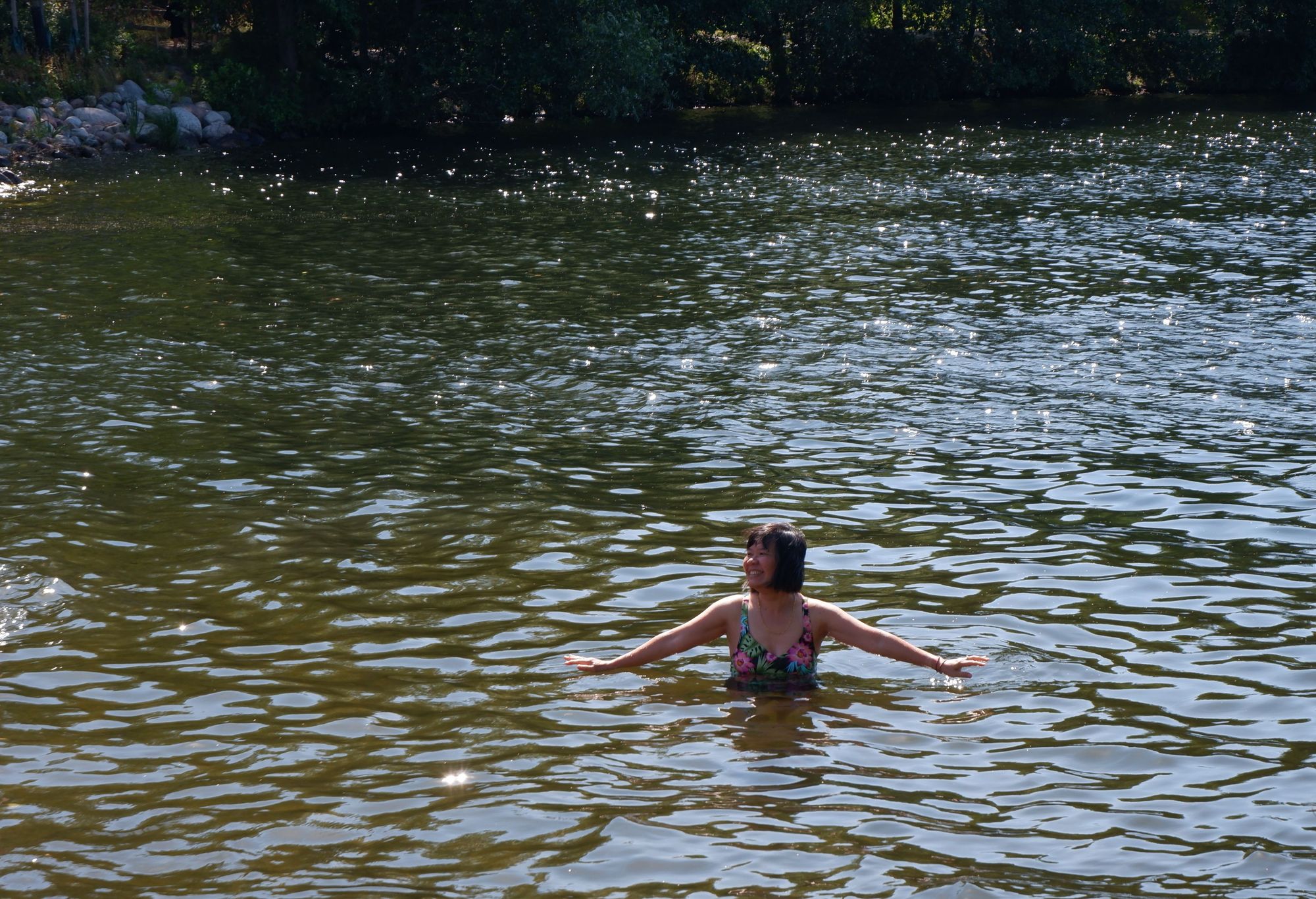 Après la danse, on marche jusqu’à Tanto et on décide d’aller se baigner. C’est un spot de baignade rigolo avec son décor urbain en arrière-plan. On nage avec les canards et on croise également ce chat tenu en laisse qui a l’air d’être ravi de se promener sur la plage. J’aimerais bien que Stormy, notre petit chat, soit aussi à l’aise en laisse !