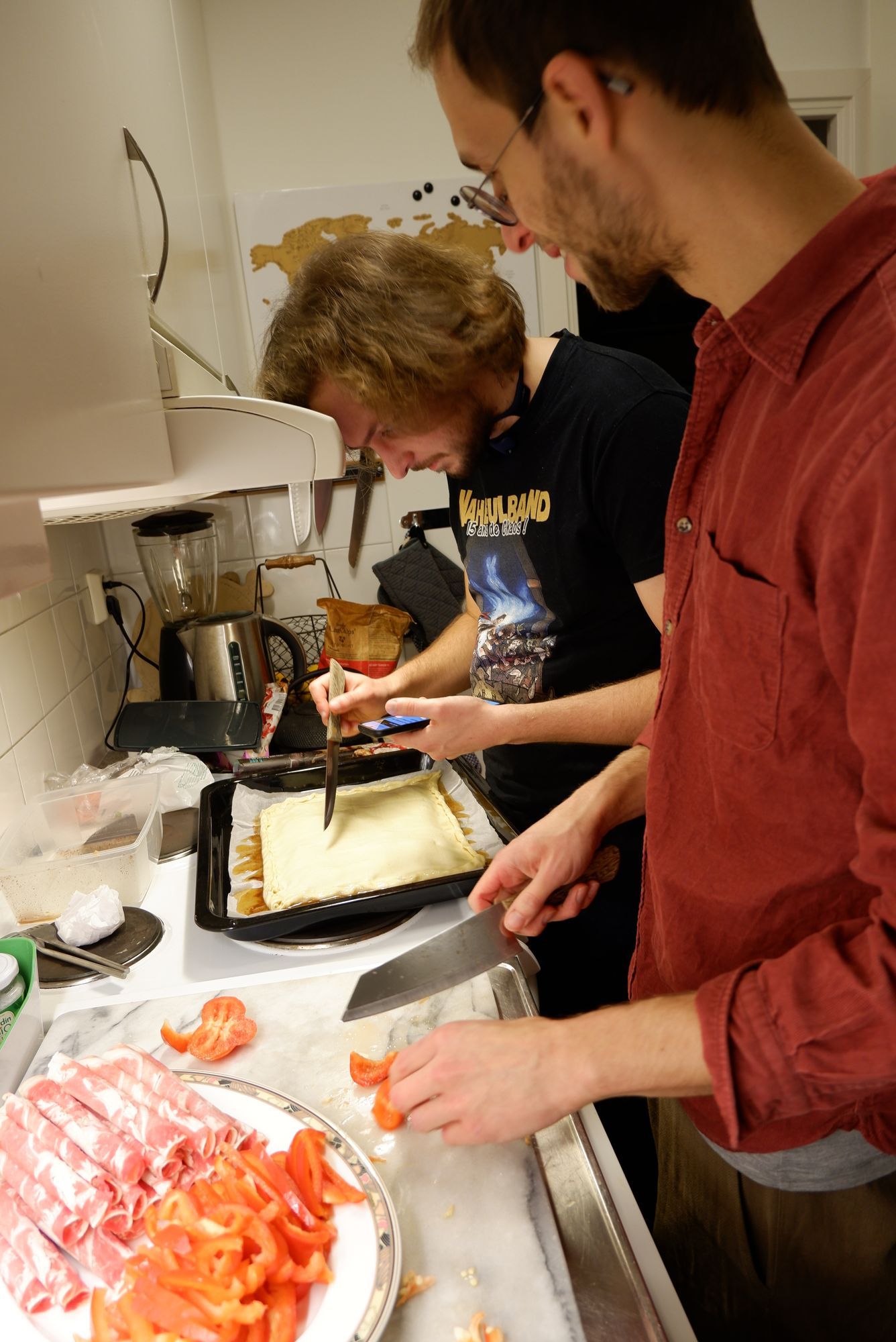 Instant vin chaud avec Andrea et Ryan, avant de rejoindre les amis danseurs (de Toulouse !) dans une pizzeria (oui, super original… En festival, il y a toujours un dîner dans une pizzeria !). Je me rends compte que la cuisine en Suède est très sucrée par rapport à ce que l’on peut manger en Suisse, en France ou plus proches, en Pologne ou Estonie. Les pâtisseries où l’on sent d’autres saveurs que le sucre ou la pâte à la farine de blé me manquent un peu à Stockholm.