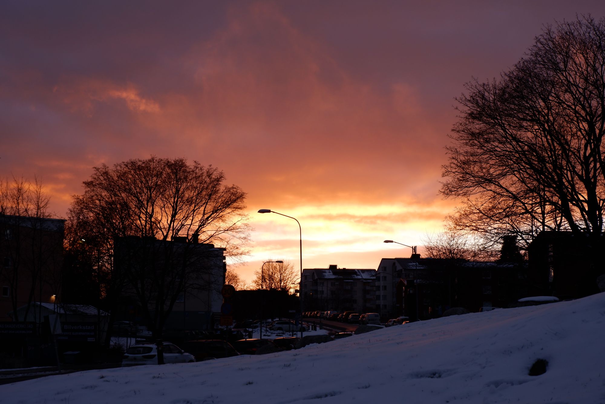 Fin de la journée, j’ai les jambes en compote, mais le coeur joyeux ! De retour à Farsta, le coucher de soleil est une explosion de couleurs et je profite de chaque minute car très bientôt, le soleil ne se couchera plus !