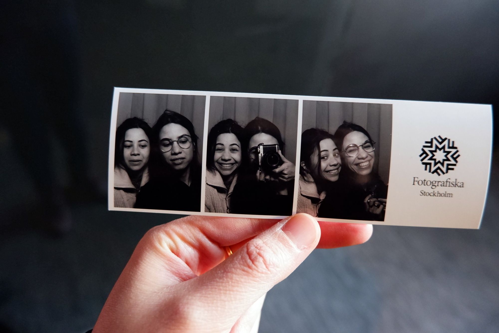 On joue aux « cool kids » et on teste le photomaton du Fotografiska. Sur la première photo, on voit qu’on n’est pas si cool et qu’on n’a pas tout à fait compris comme le photomaton fonctionne. On a été un peu prises de court ! Mais on a aussi appris quelque chose en suédois. Alors que l’on dit « cheeeese » pour sourire pendant que l’on pose, les Suédois disent « omelette ! »
