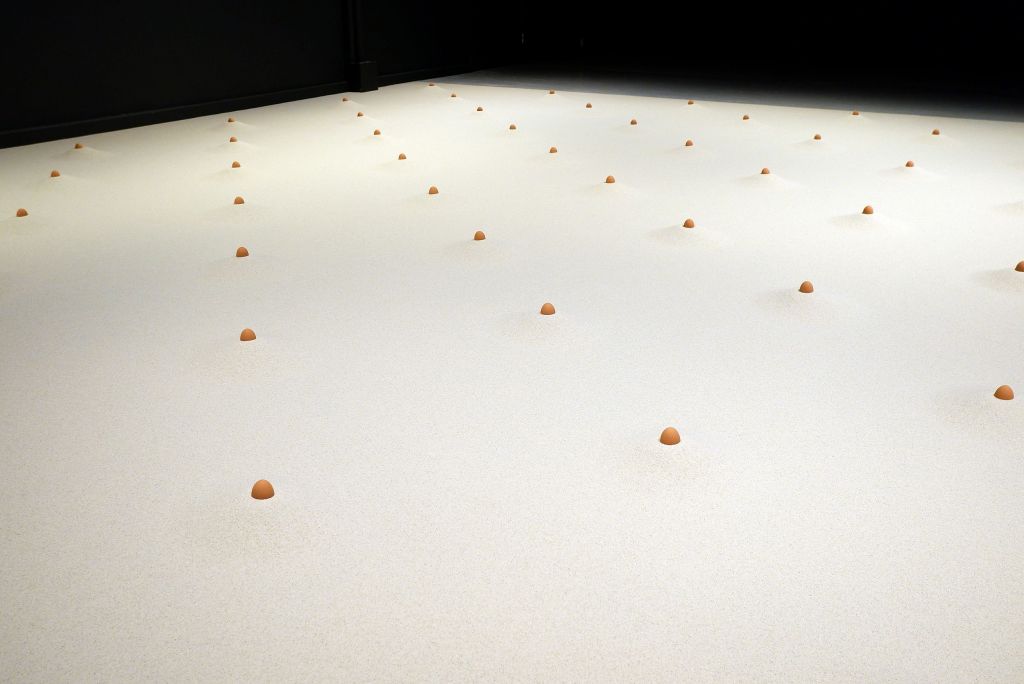 Ci-dessus, Eggs (1972/2021) ,par Connie Zehr. Ce sont des oeufs posés sur du sable et je suis un peu perturbée, car je trouve ça à la fois reposant et intriguant : comment placer les oeufs sans faire de marques dans le sable ?