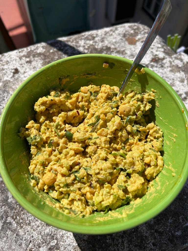 *à part une fois, la semaine dernière. J’ai testé cette recette de pois chiches à la mayonnaise au curry et quand j’ai goûté la première cuillérée, je me suis exclamée avec beaucoup de certitude (et la même expression que le “not bad” d’Obama): “I-am-amazing!” (”je suis fantastique !”).